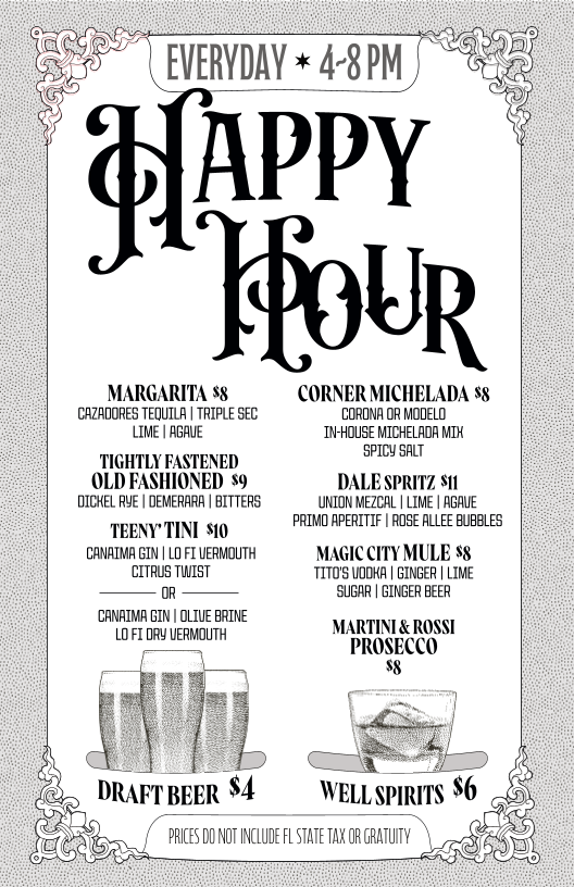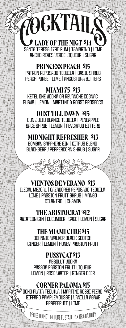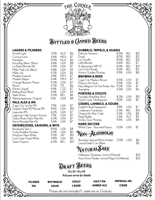 Welcome to The Corner, a hidden gem nestled at 1035 N Miami Ave in the heart of Miami. This cozy gastro pub offers a delightful menu tailored for casual diners and cocktail enthusiasts alike. Start with light bites like Olives & Cornichones or indulge in a classic Chicago Dog, expertly crafted with all-beef hot dogs and savory toppings.